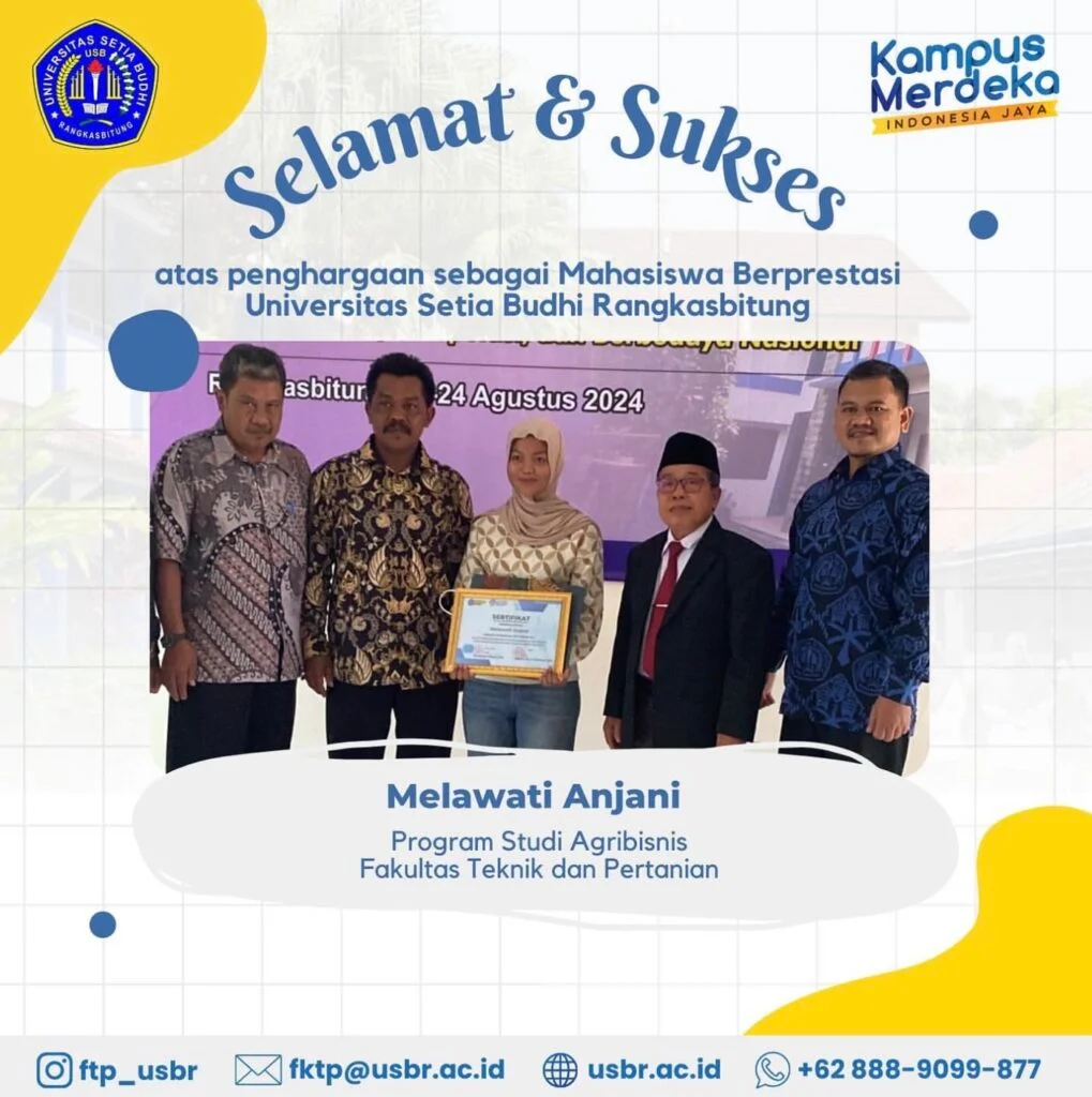 Mahasiswa prodi Agribisnis tahun angkatan 2023 dianugrahi penghargaan sebagai Mahasiswa Berprestasi di lingkungan Univeristas Setia Budhi Rangkasbitung, tahun akademik 2024/2025.